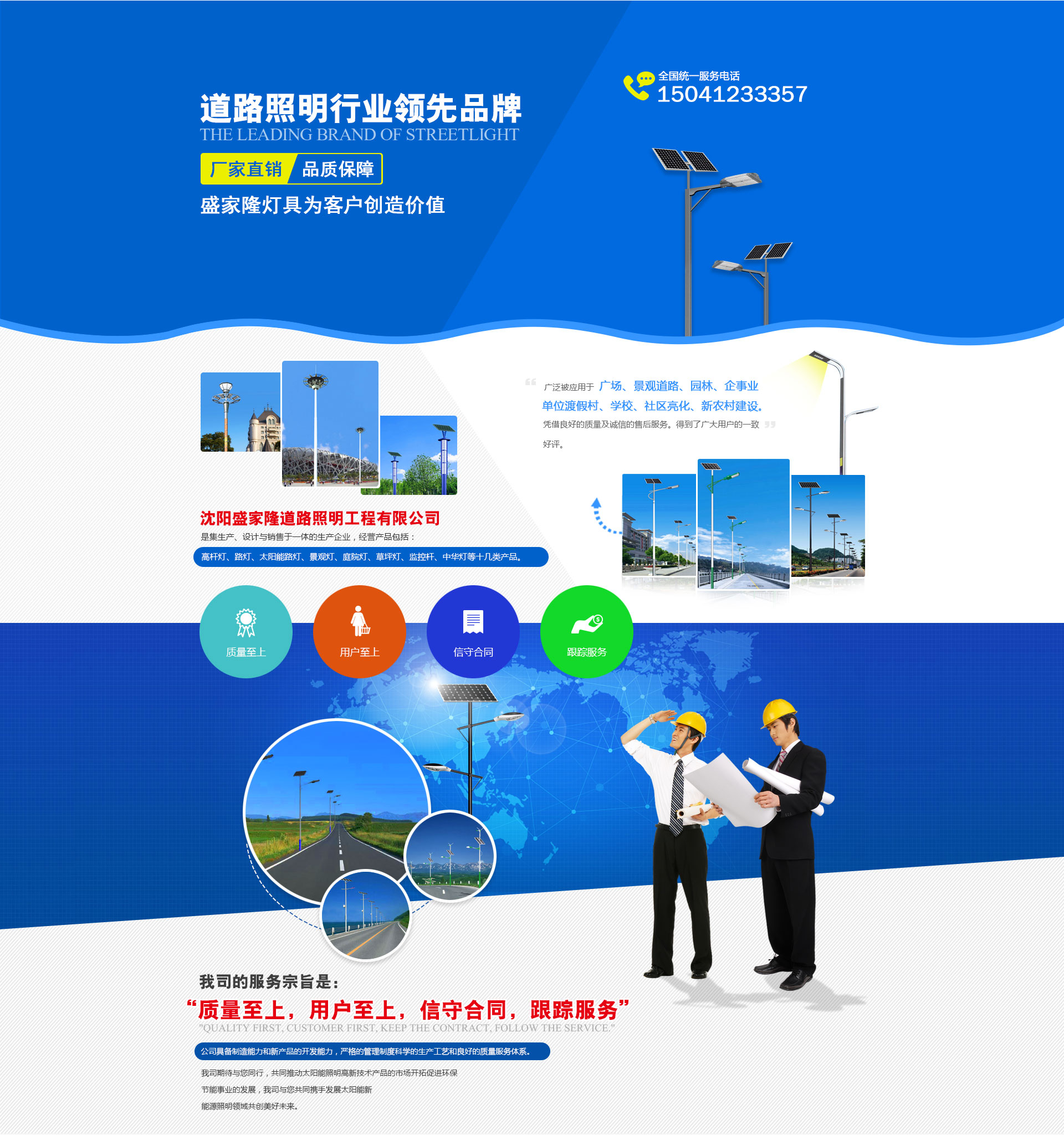 沈陽盛家隆道路照明工程有限公司坐落于沈陽市于洪區興盛村愛國,生產各種室外,道路,廣場,車站,碼頭,橋梁,庭院及室內工礦照明燈具,品種有太陽能路燈,道路燈,LED路燈,組合燈,景觀燈,庭院燈,草坪燈,彩色泛光燈,中高桿燈以及配套使用的各種路燈頭,鎮流器,觸發(fā)器開關箱等系列產品。 本公司自成立以來,已初具規(guī)模,現有高級技術人員5人,中級技術人員28人,研究設計人員14人,車間工人百余人,并備有大型斬彎機,1600t-900t壓鑄機,20t行吊,高速縱剪機,埋弧自動焊,彩色噴塑線燈先進設備,高科技創(chuàng)造高質量,由我公司生產的各種類型的照明燈具,不僅質量可靠而且線條流暢,外形美觀,深受廣大客戶的喜愛,長期以來,我公司一直注重產品質量,堅持“質量是企業的生命”的宗旨。由于質量可靠,價格合理,服務周到,從而贏得了廣泛的市場聲譽。企業先后被評為“質量信得過企業”“重誠信守信用企業”,“AAA級資信企業”,并通過ISO9001:2000國際質量體系認證,ISO14001:2004環(huán)境管理體系認證,CCC,CQC國家強制性產品認證和持有道路照明二級安裝,安全生產資質。